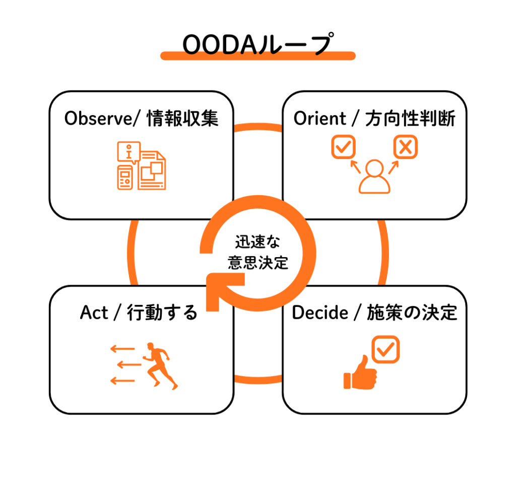 「はい。状況を素早く判断し、行動につながる決定をするためのループです。OODAはOBSERVE監視・ORIENT情勢判断・DECIDE意思決定・ACT行動のサイクルを繰り返すことによって、健全な意思決定を実現するというものです。」
